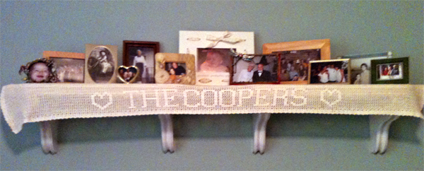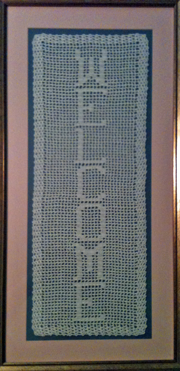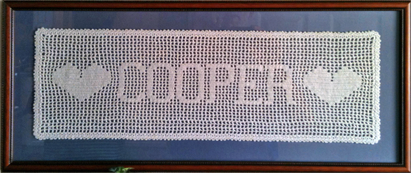 Every married Smeller, Leardi, Cooper and whoever has a filet of their name from me as a wedding gift. The only one that is a bit different is Heidi Smeller's filet which reads Smell-Connors. That's what she uses on her mailing labels, etc. She and Ian have it proudly hanging over the couch in their family room.