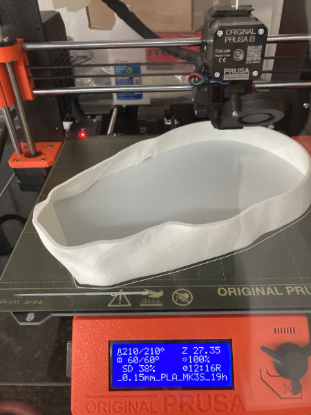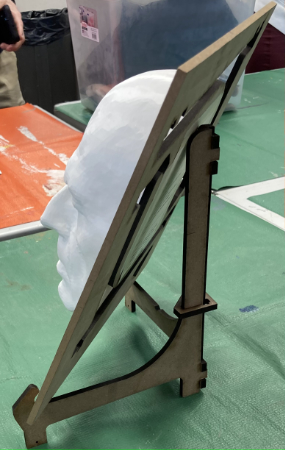 I got a new toy: a 3D Scanner. This is my first use of the scanner. I took a selfie. And 3D-Printed it in white PLA filament. This is also my first use of the CNC mill to carve a true 3D model. I've always done 2-and-a-half-D. The blue block is machinist's wax. It saves on broken tool bits.