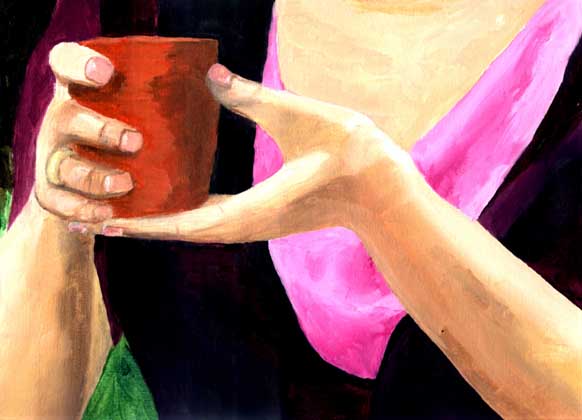 Jan 2002. Yukie is a Japanese friend of Barbara Norris-Fuchs in Düsseldorf, Germany. This is a blown up detail from a photograph taken by Barbara with 35mm film The occassion was a picnic on the grounds of ????., summer 2001. Yukie is holding up a cup of green tea.