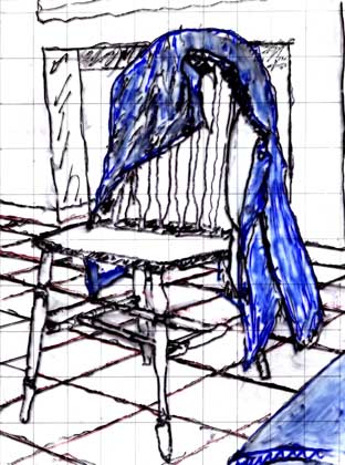 Jan 2002. This is Smellè's jacket tossed over the back of a chair. This sketch is done with blue and black felt tip pens on, and looking through, a sheet of Plexiglas. The opposite side of the Plexiglas has been scored with a grid pattern.