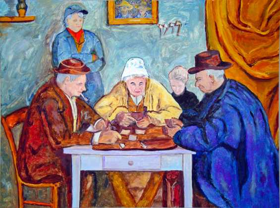 "Card Players" by Cezanne is adapted here by Smellzanne and the Not-Ready-for-Primetime Hunter Art Group. With a little PhotoShop magic the painting on the wall shows Vincent Van Gogh together with Smelle, a.k.a. "Vinny and Me".